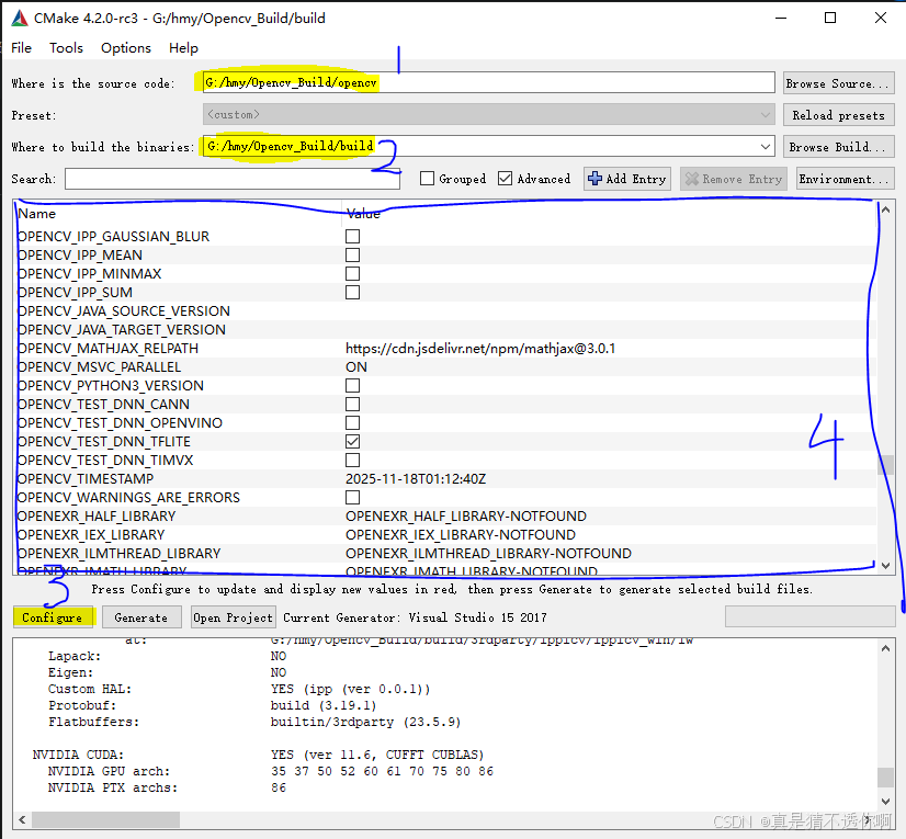 不同版本的opencv编译选项不同,甚至别的博主跟你下载同一个版本编译选项也不一样