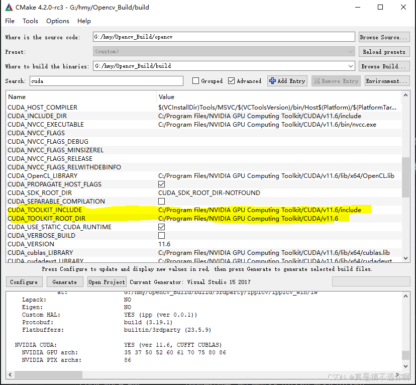 - 如果有CUDA_TOOLKIT_ROOT_DIR变量,填cuda目录。如果没有,Add entry新建变量填目录(我在填这个变量之前,搜索cuda没有这么多选项,填完这些选项就出来了)(注意新建时变量类型是FilePath还是path)