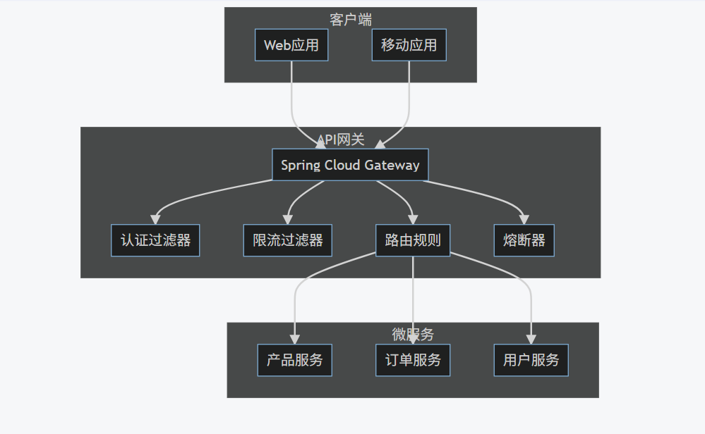 API网关作为微服务架构的入口点,处理请求路由、认证、限流等横切关注点。