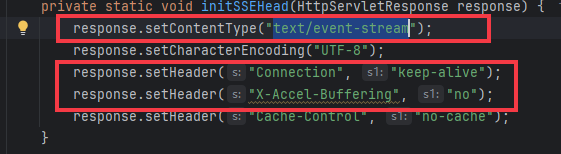 1. 禁用缓存功能,服务端响应时除了设置 SSE 所必须的 Response Header 外,还需要添加非标 Header:X-Accel-Buffering=no,告知 Nginx 不缓存响应,确保数据实时发送到客户端。