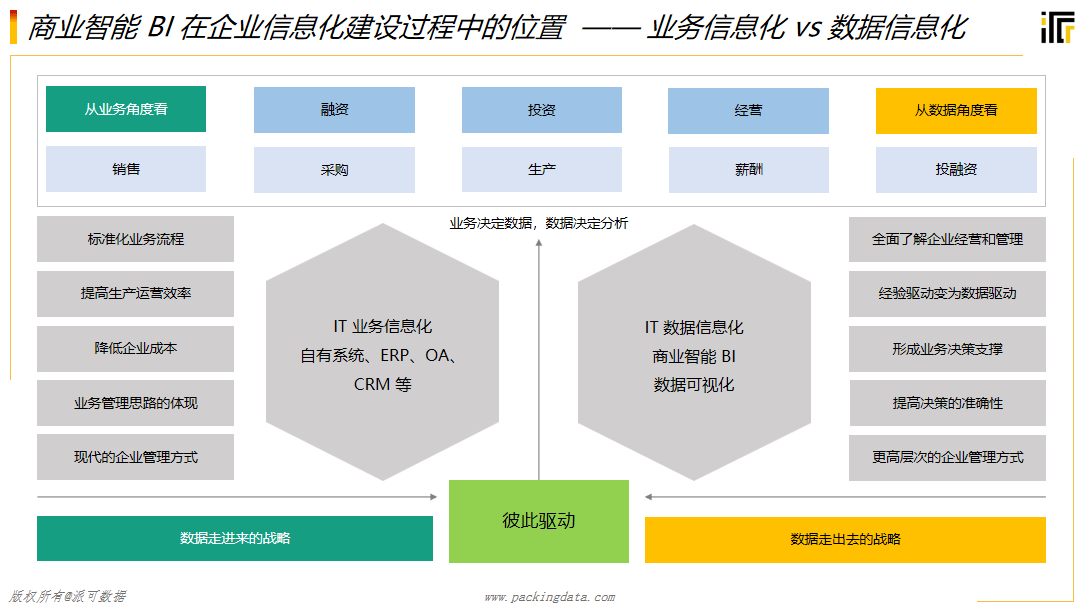 信息化建设具有连贯性,没有业务系统的建设,就不会有数据的沉淀,而没有数据的沉淀,就没有建设商业智能 BI 的基础。同时,商业智能 BI 的建设能够反向推动业务信息化的建设,优化业务流程的同时提高数据的质量。