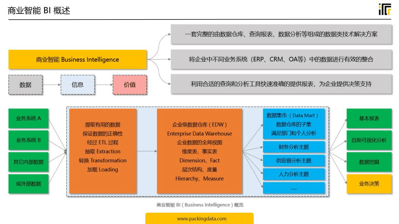 简单来说,商业智能BI指的就是主要由数据仓库、数据分析、查询报表、数据可视化组成的数据类技术解决方案,可以将海量杂乱的数据转化为可用的信息,满足企业不同人群对数据查询、数据分析和数据挖掘的需求,从而为业务和管理人员提供信息支撑,促进业务发展,辅助进行决策。