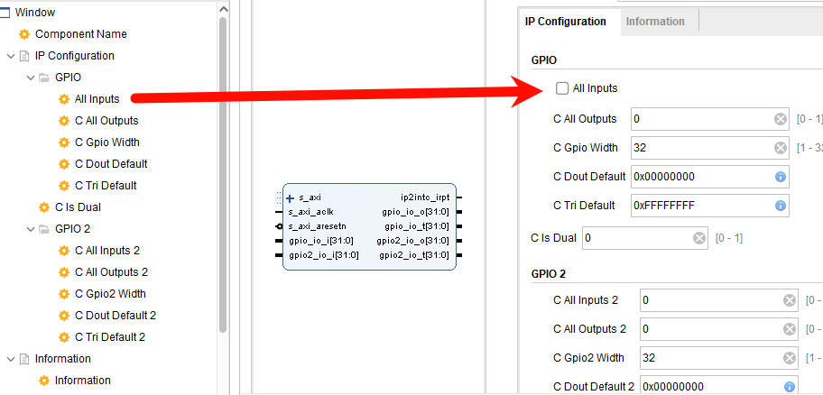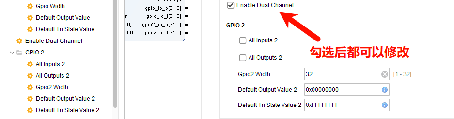 C All Outputs也是同样设置。C Gpio Width、C Dout Default、C Tri Default不需要设置,修改显示名称即可。C Is Dual按照下图设置即可: