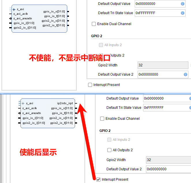 第一组就是中断相关,需要将第七页中Interrupt Present(使能中断)打开后才在IP上显示,我们直接修改: