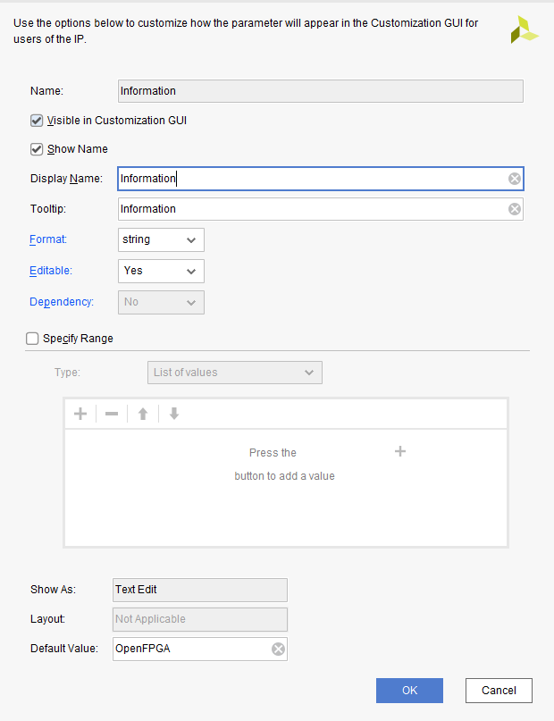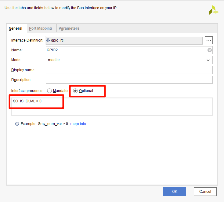 C All Inputs 2 在C Is Dual等于0情况(不使能),不能进行修改,那么在Editable选择Dependent,然后填写表达式:$C_IS_DUAL > 0 ,表示C Is Dual不勾选则不能修改,其他参数同这一参数,全部一样修改即可。