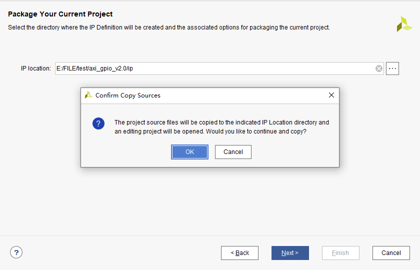 点击Next后会有警告信息,大概就是源文件会被拷贝到新文件夹中并且会打开封装IP的工程(自动),询问是否继续,这里点击OK