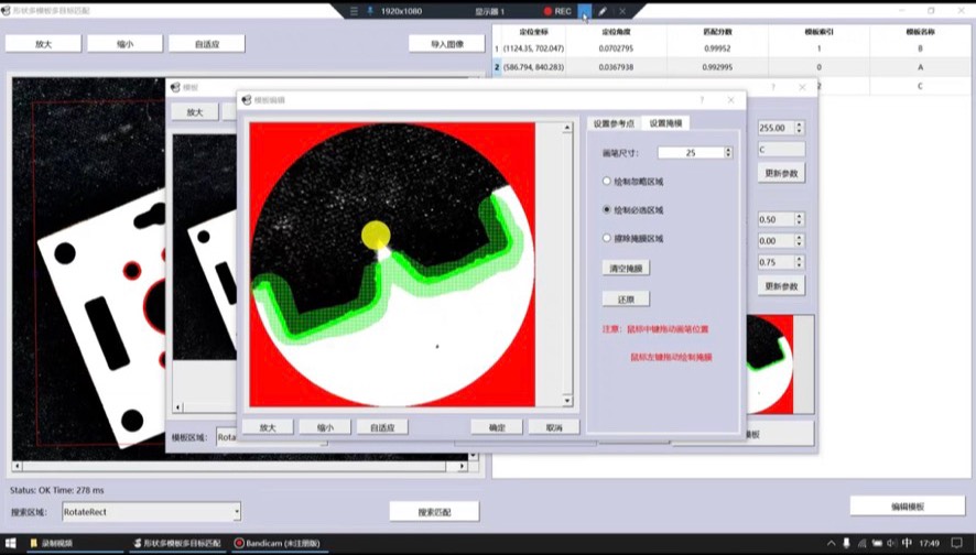 C++ OpenCV模板匹配框架源码,包括有方向矩形ROI、圆形ROI、环形ROI创建模板,画笔可以对模板区域涂抹实现屏蔽或选取,c++ opencv开发的基于形状多模板多目标的模板匹配源码,可实现定位,计数,分类等等,定位精度可达亚像素级别,运行速度采用并行加速。 开发工具:qt(msvc2015) + opencv4.6,工具自备