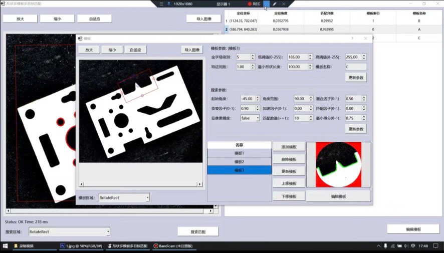 整个框架在Qt里跑起来的样子还挺专业,左侧是模板编辑区,右侧实时显示匹配结果。比较实用的功能是模板库管理,支持导入导出二进制的模板数据文件,方便产线换型时快速切换。