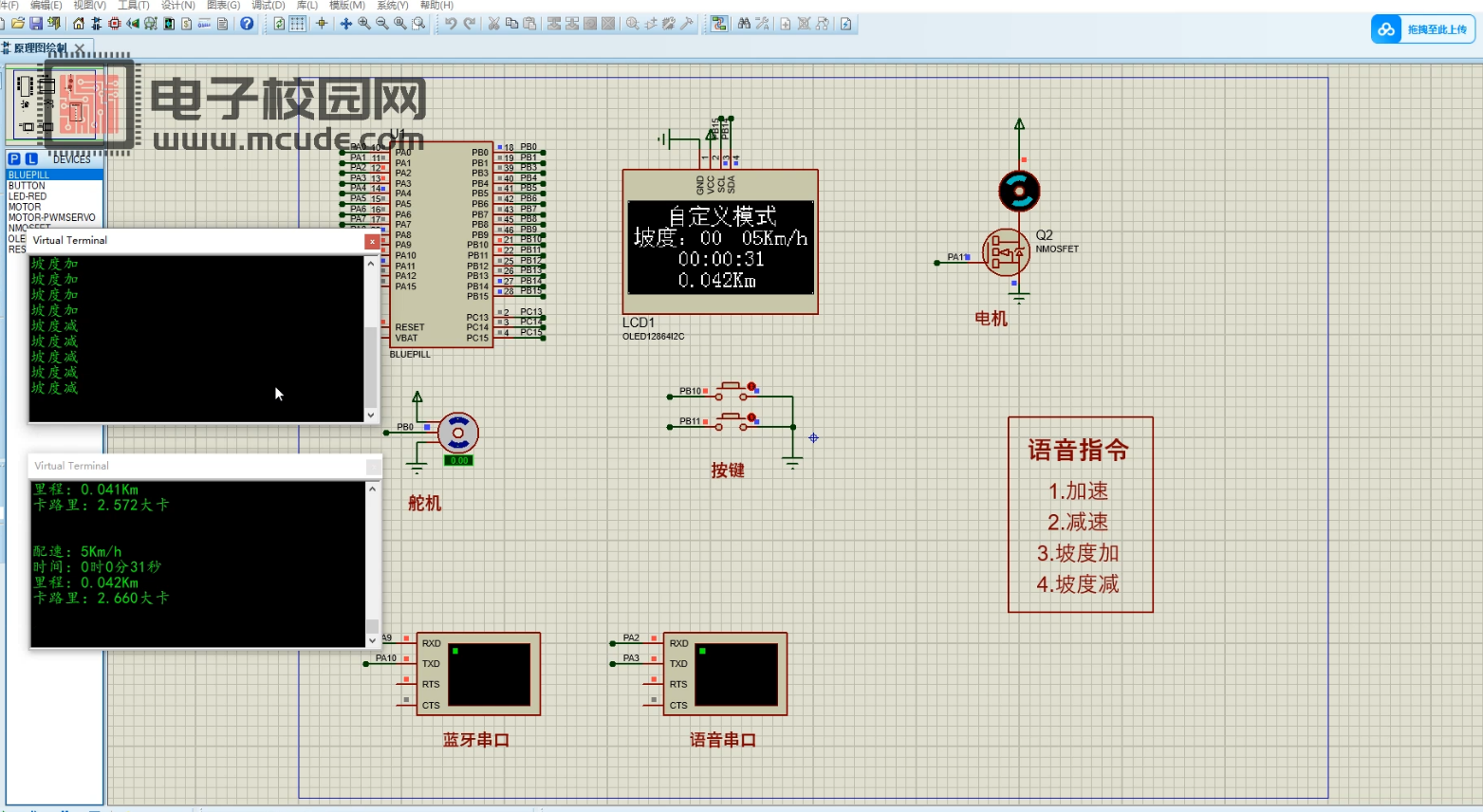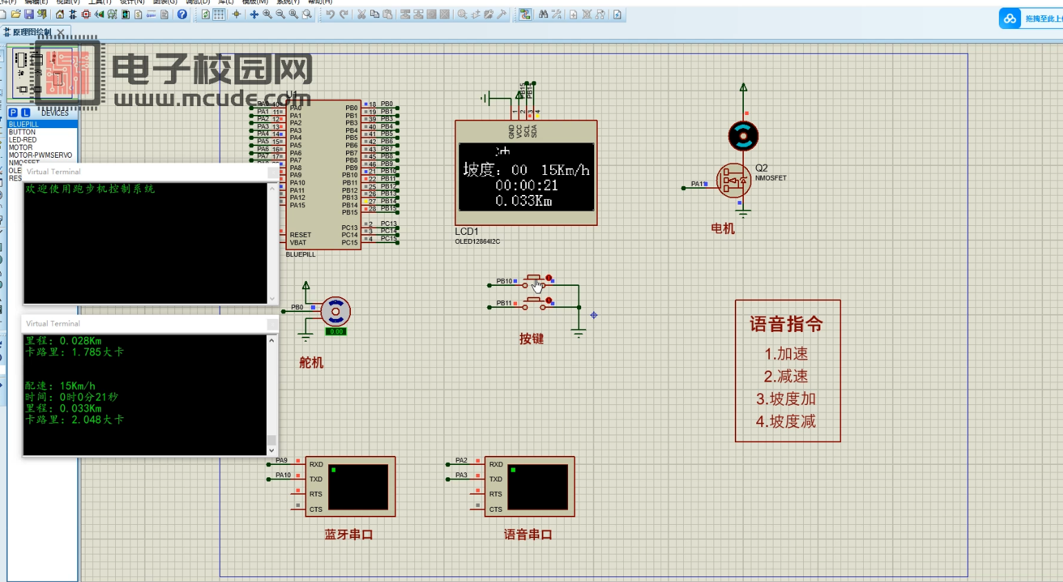 - 数据处理:根据语音指令和按键操作,调整跑步机的工作状态,如速度、坡度等。