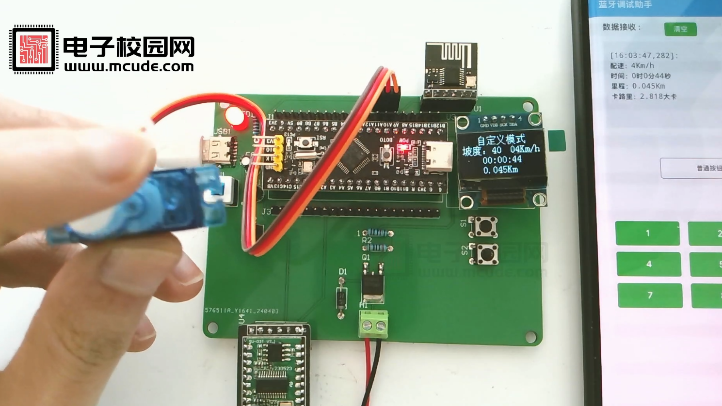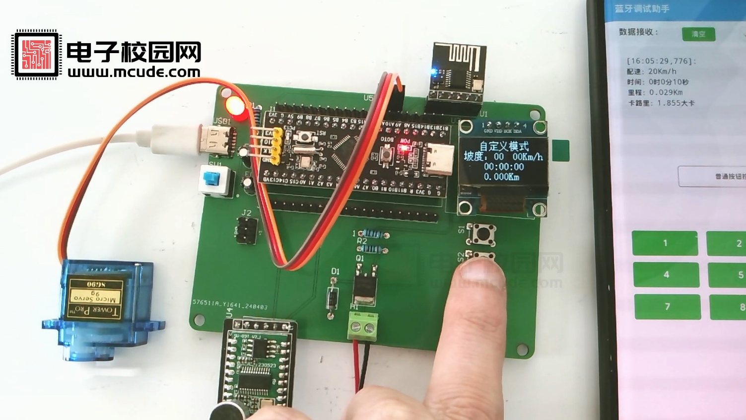 - 舵机:通过改变舵机的转动角度来模拟跑步机的坡度变化,提供真实的跑步体验。