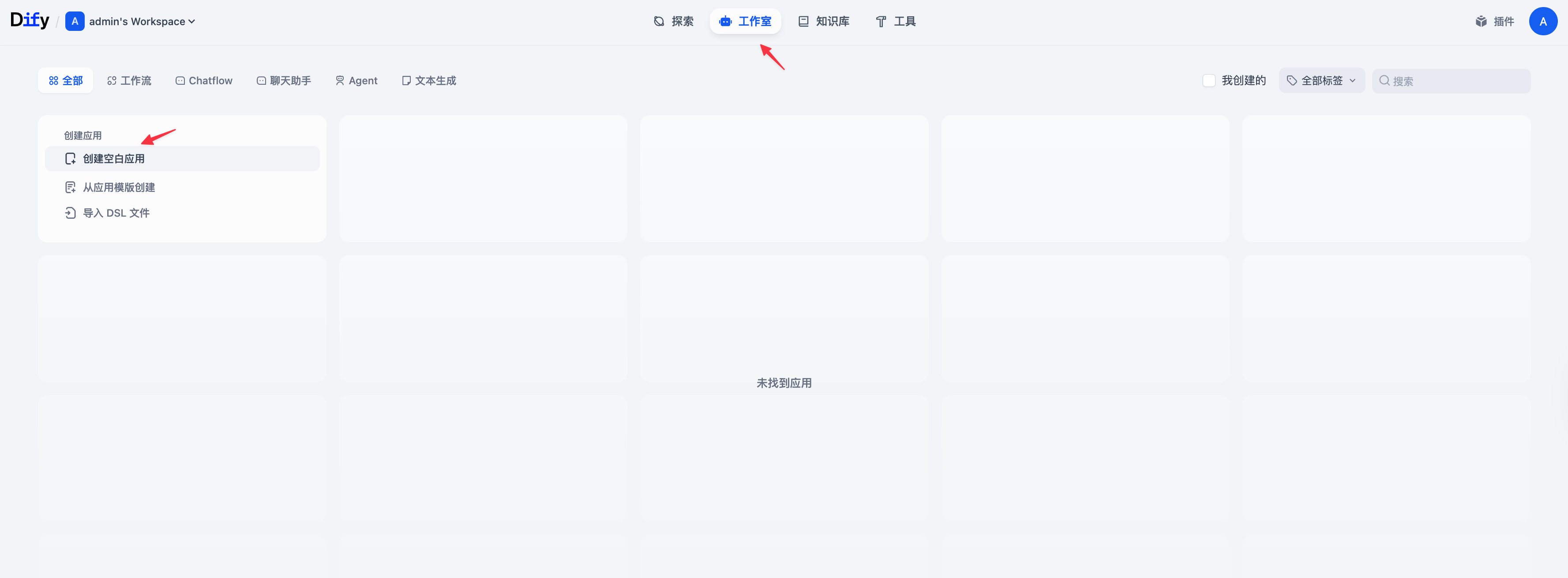 点击工作室标签页,进入应用管理界面,点击创建空白应用。