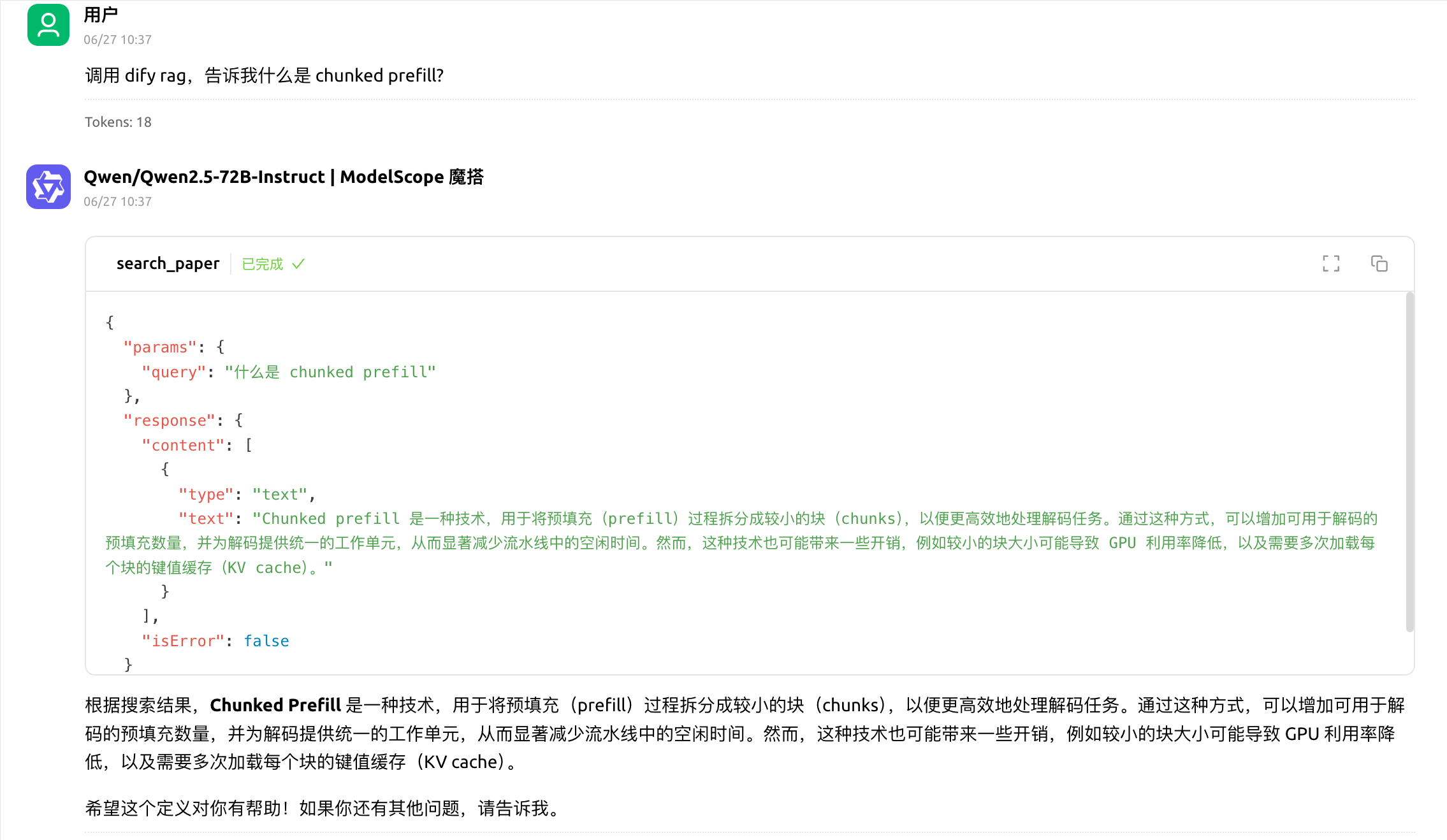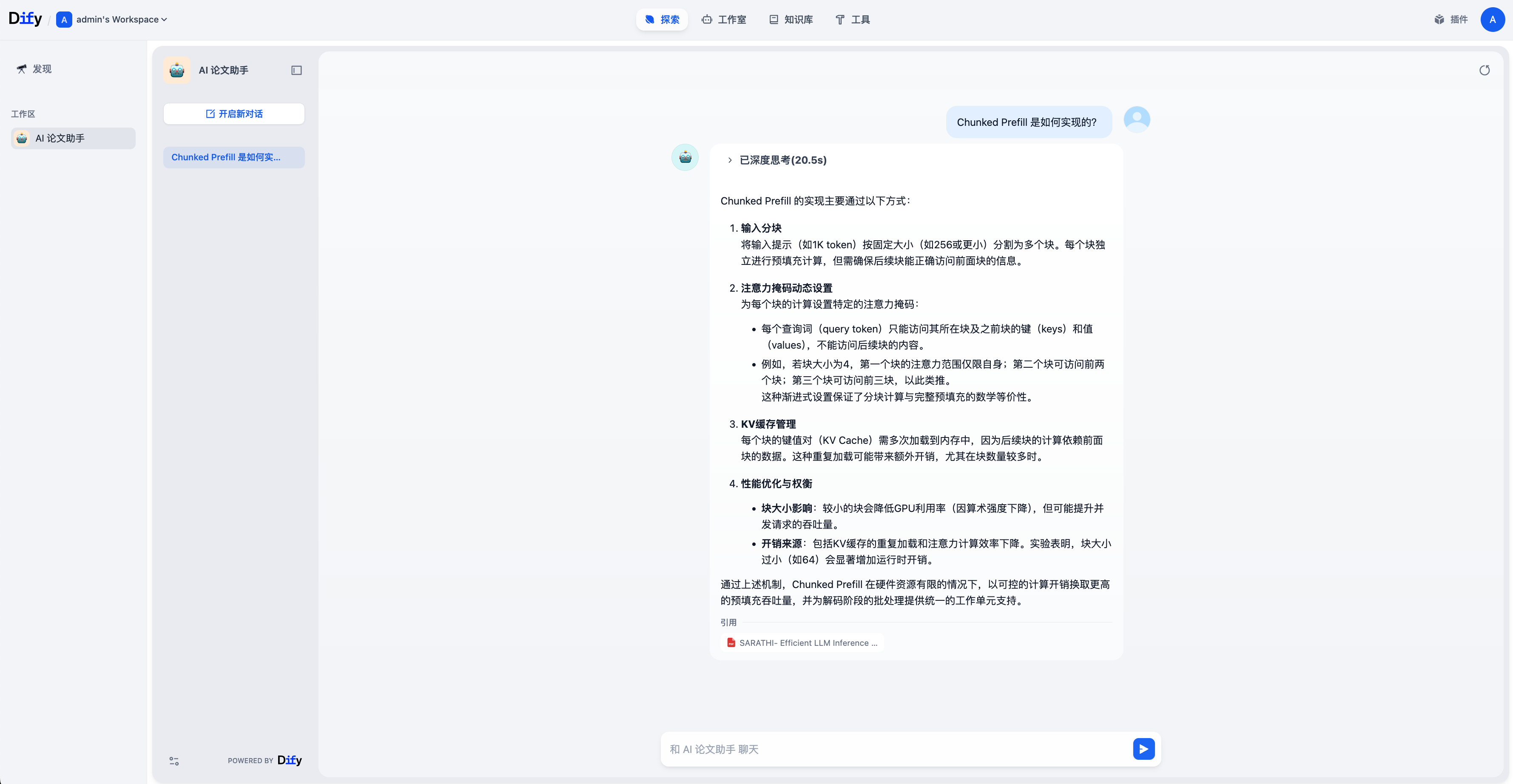 添加上一步索引的知识库作为聊天助手的上下文。然后可以在右侧聊天框里进行应用调试,例如询问什么是 Chunked Prefill?。从输出可以看到,AI 会根据文档内容生成回答,并附上引用的来源片段。
