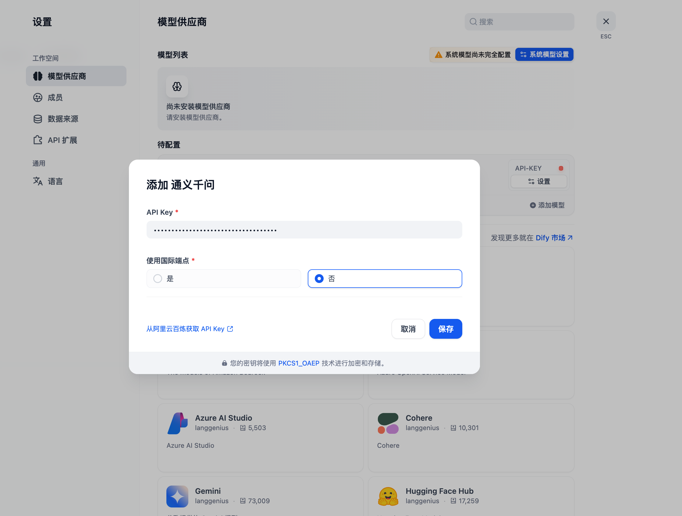 点击模型供应商,这里我选择将通义千问作为模型供应商。读者也可以自行选择其他模型供应商。