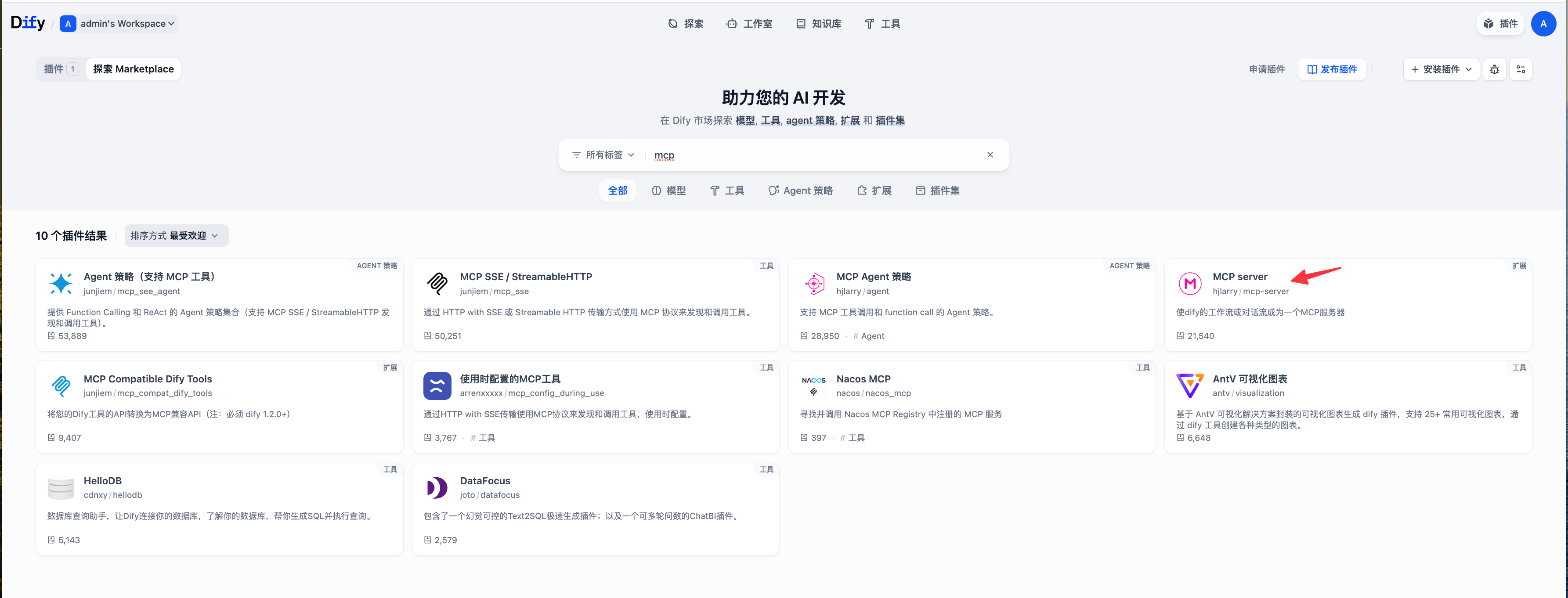 在 Dify 的 Marketplace 中选择 MCP server 插件进行安装。