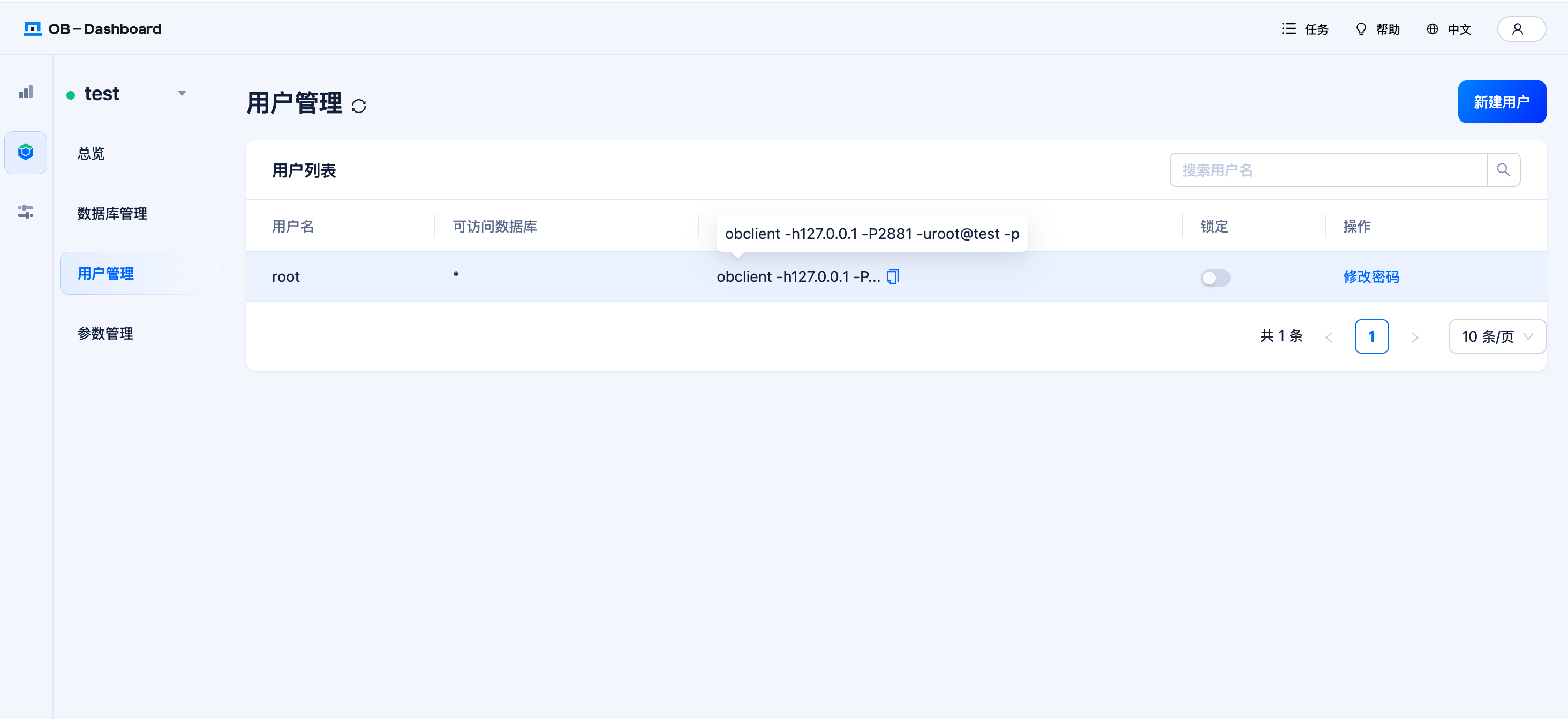 默认情况下,OceanBase 会创建两个租户 sys 和 test,我们将在 test 租户下创建 Dify 使用的向量数据库。第一次需要为 test 租户设置密码。
