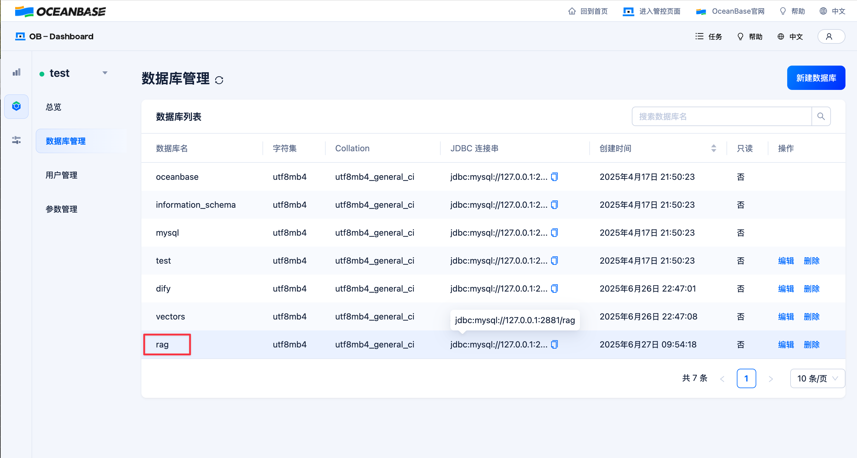 在 数据库管理 页面中,新增一个名为 rag 的数据库。