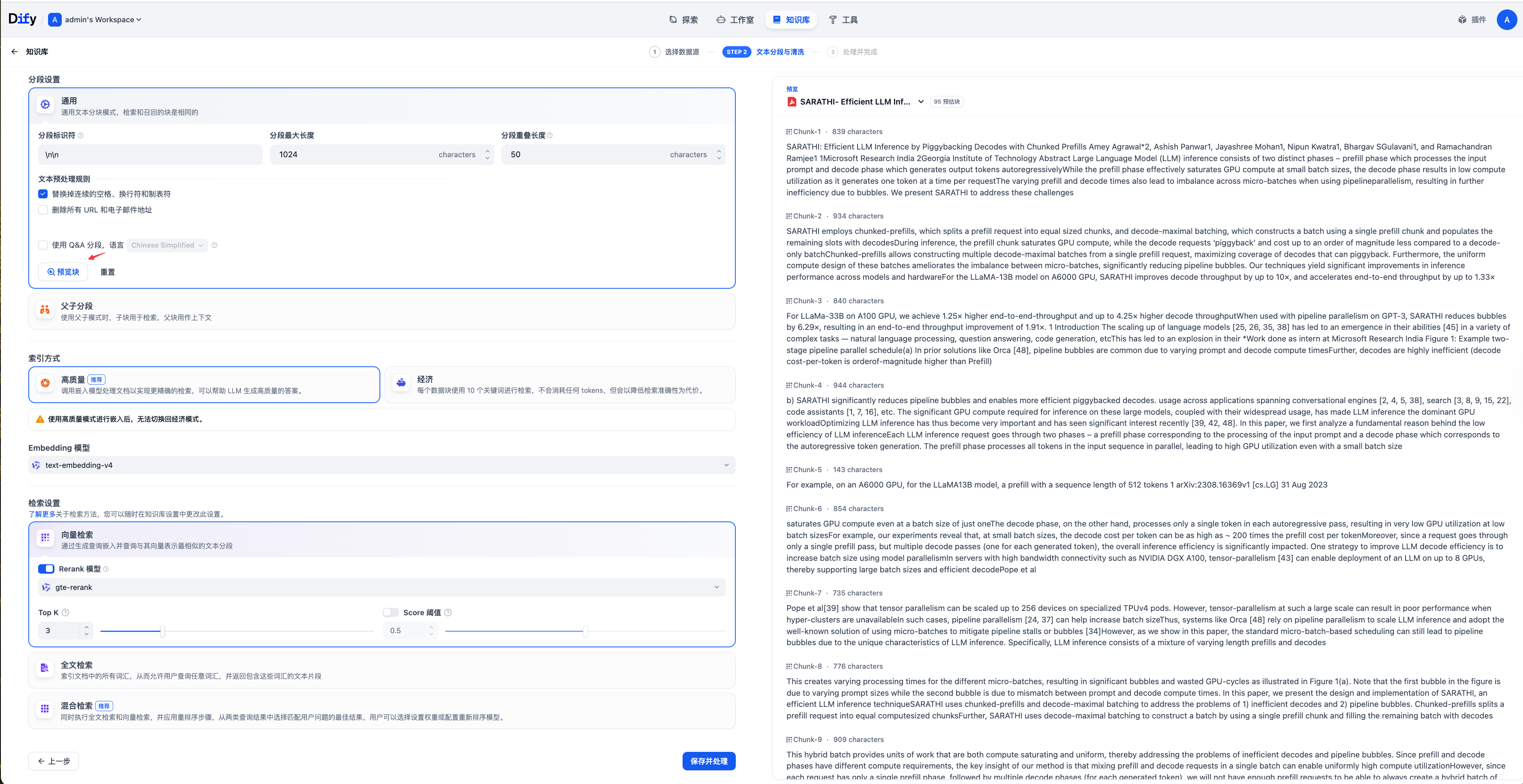 然后设置文本的分段规则,这里可以保留默认设置。点击预览块可以在右侧预览分段后的结果。确认没问题后,点击 保存并处理。