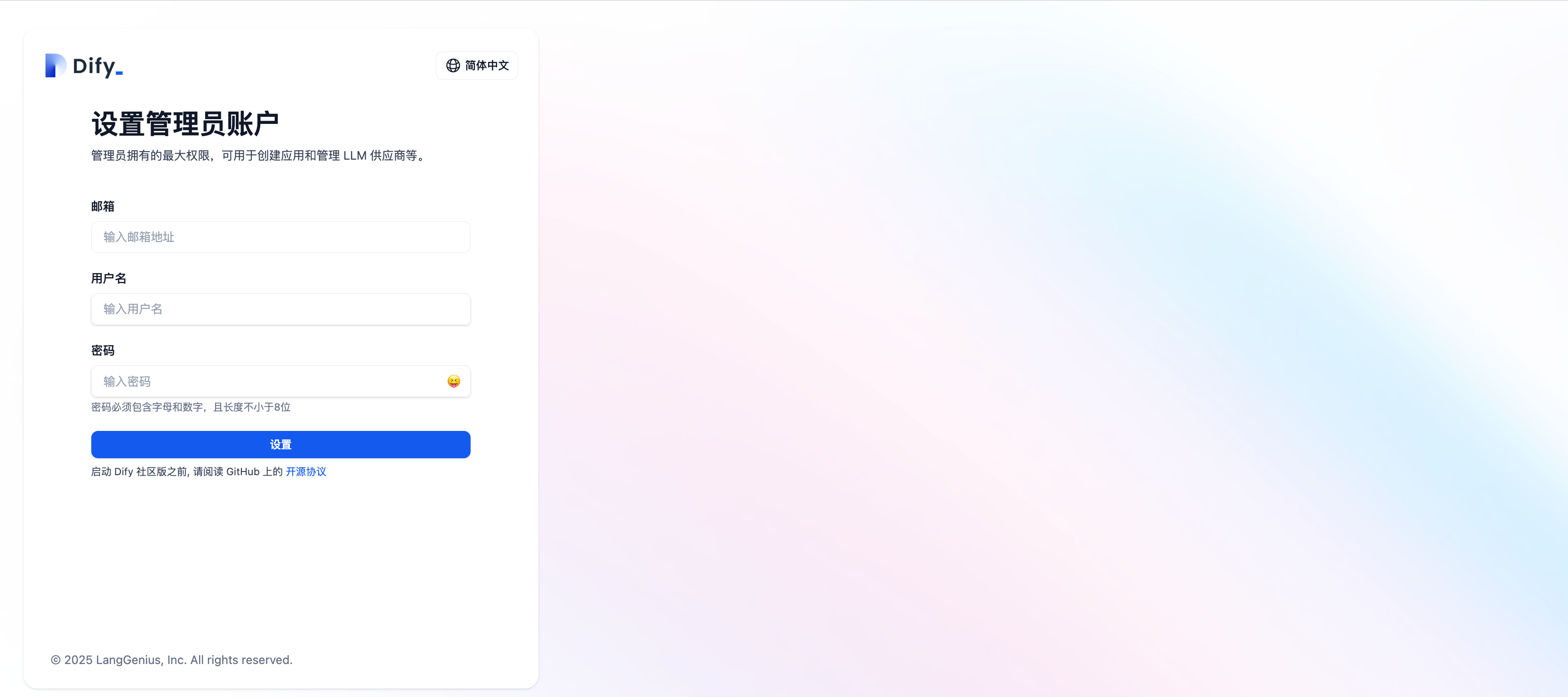 服务启动后,浏览器输入 http://localhost 即可访问 Dify 的 Web 界面。第一次登录需要设置用户名和密码。