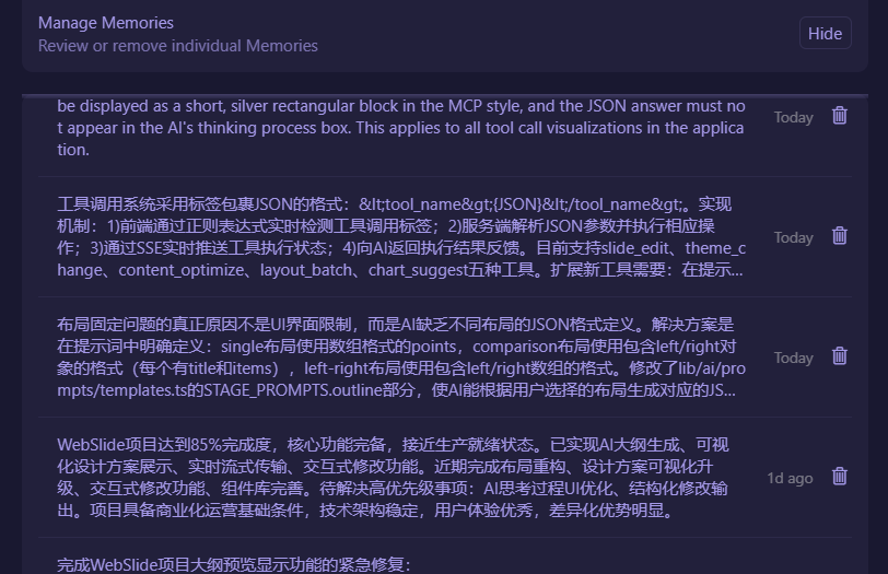 - 对话记忆:比如你让 AI 生成一个 React 组件,它会记住你要求的「暗黑模式」「响应式布局」等参数,下次调用时自动复用规则,减少重复沟通成本。
