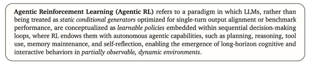 - Agentic RL 是一种将 LLM 视为可学习的策略,通过强化学习提升其作为智能体与环境交互并实现长期目标的能力的框架。