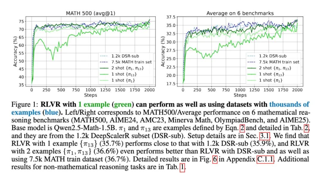 1Shot-RLVR [30] 证明了仅使用一个训练示例的强化学习在提升数学推理能力方面是有效的。具体而言,它对基础模型 Qwen2.5-Math-1.5B 应用一个训练示例,就在 MATH500 基准测试中将性能从 36.0% 大幅提升到 73.6%,并在六个主要数学推理基准测试中平均从 17.6% 提升到 35.7%。这表明,即使使用少量数据,也能有效地激活 LLM 的推理能力,达到甚至超越使用数千个示例数据集时的性能。