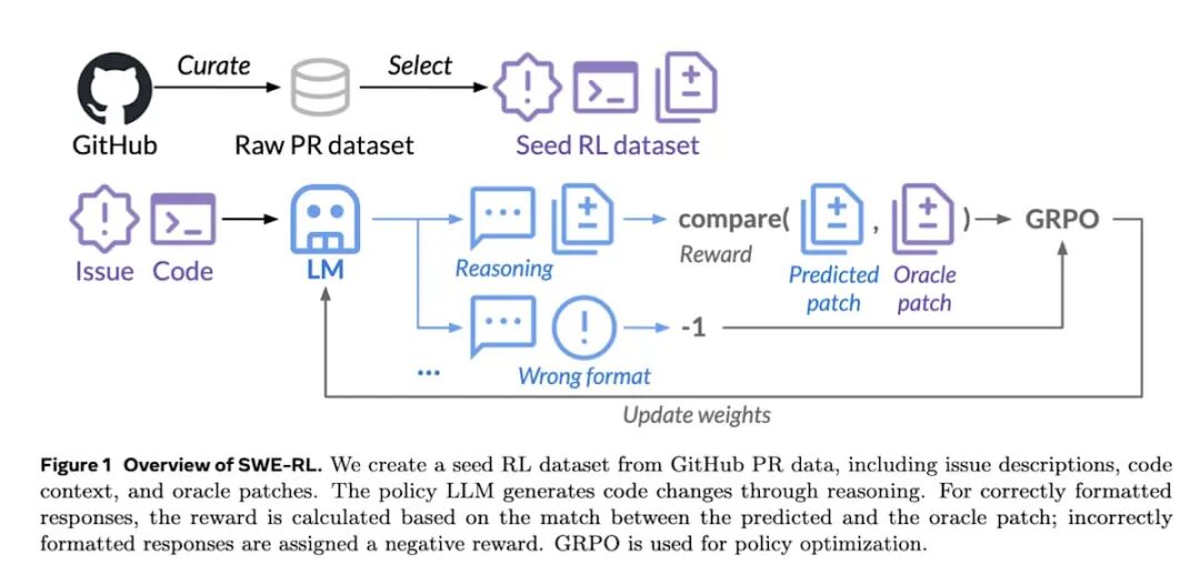 SWE-RL [27] 构建了一个强化学习数据集,它从 GitHub 的 460 万个公开仓库中,按时间顺序收集了 issue、pull request 和 review comments。