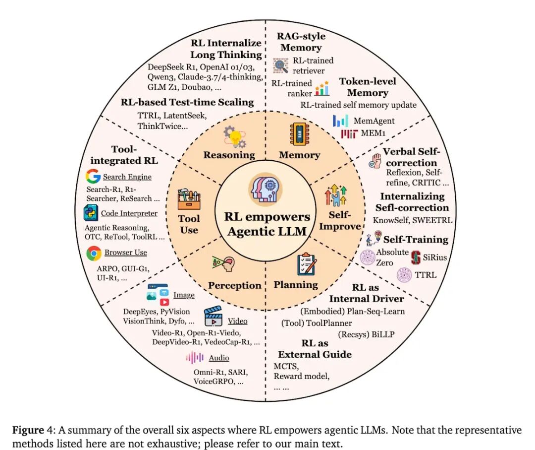 - 强化学习正在用于改进智能体的六项核心能力:推理、工具使用、记忆、规划、自我改进和感知。