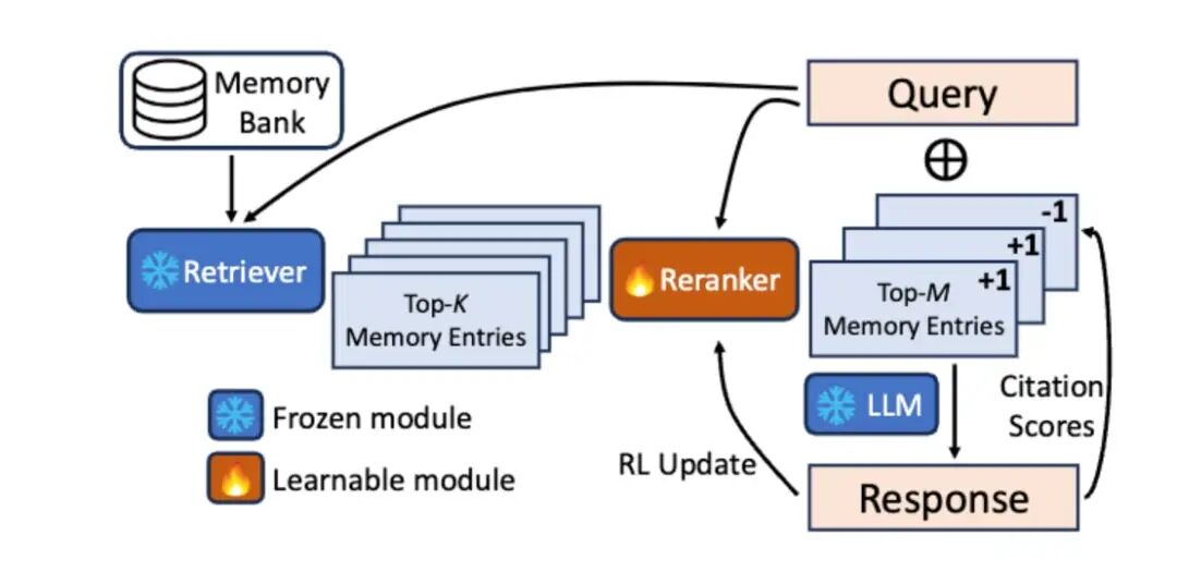 - 对被引用的记忆给予正面奖励 (+1),对未被引用的记忆给予负面奖励 (-1),并更新重排序器的参数。