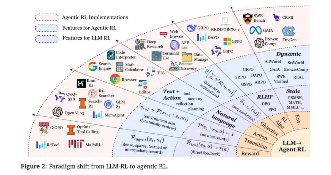 综上所述,强化学习在 LLM 上的应用已从偏好微调扩展到提升 LLM 的推理能力和作为智能体的工具使用性能。基于这些历史背景,本文接下来将介绍 Agentic RL。