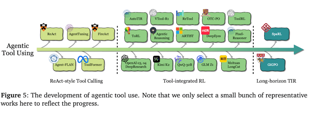 工具使用指智能体调用并活用外部信息源、API、计算资源等的能力。这包括通过搜索引擎获取信息、使用计算器或执行代码、向其他模型发送查询等,即与任务完成所需的所有外部工具进行交互。通过强化学习,智能体能够从试错中学会**“何时、使用哪个工具、如何使用”**。其发展大致分为三个阶段。