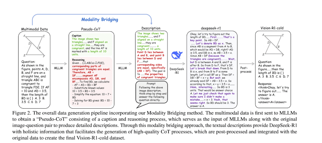 - 第一阶段:模态桥接 (Modality Bridging) 和模仿学习:通过 MLLM 将视觉信息转换为详细的文本描述,然后将这些文本传递给 DeepSeek-R1,使其输出详细的 CoT。接着,将 DeepSeek-R1 的 CoT 作为正解标签,对 MLLM 进行模仿学习,使其能够稳定地生成基于视觉信息的 CoT。