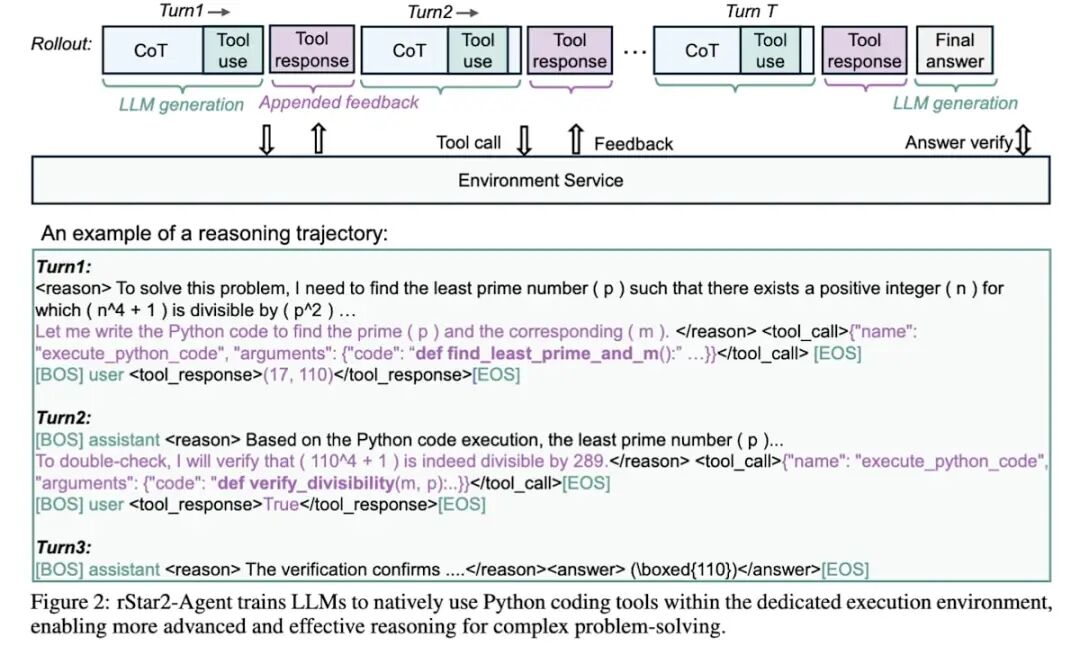 rStar2-Agent [29] 针对困难数学任务,通过纯粹的 Agentic RL 方法,在没有推理数据 SFT 的情况下,以 14B 参数实现了超越 671B 的 DeepSeek-R1-Zero 的性能和学习效率。这项研究的特点在于,它像工具使用章节介绍的 ReTool 一样,利用 Python 执行环境作为工具进行工具集成型推理,并引入了一种名为 “Resample on Correct (RoC)” 的技术,即在多次 Rollout 生成的候选答案中,优先采样没有过多工具调用错误的优质成功案例进行学习。