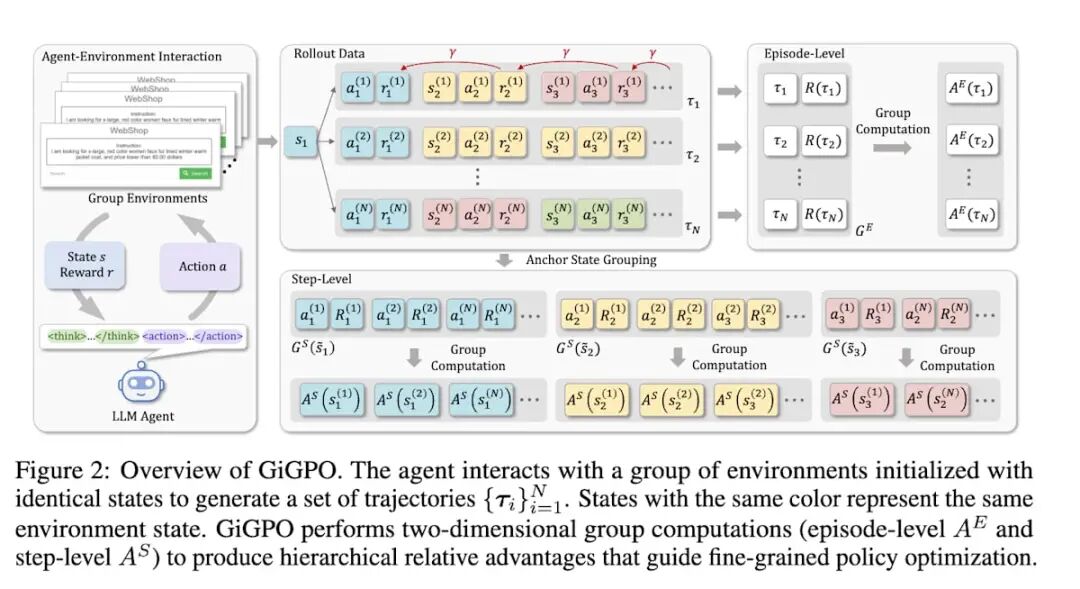 GiGPO [13] 为了解决这个问题,采用了一种名为 Group-in-Group Policy Optimization (GiGPO) 的方法,它在情节级别和步骤级别两个分组结构中计算优势值 (advantage,即衡量行动好坏的标准)。