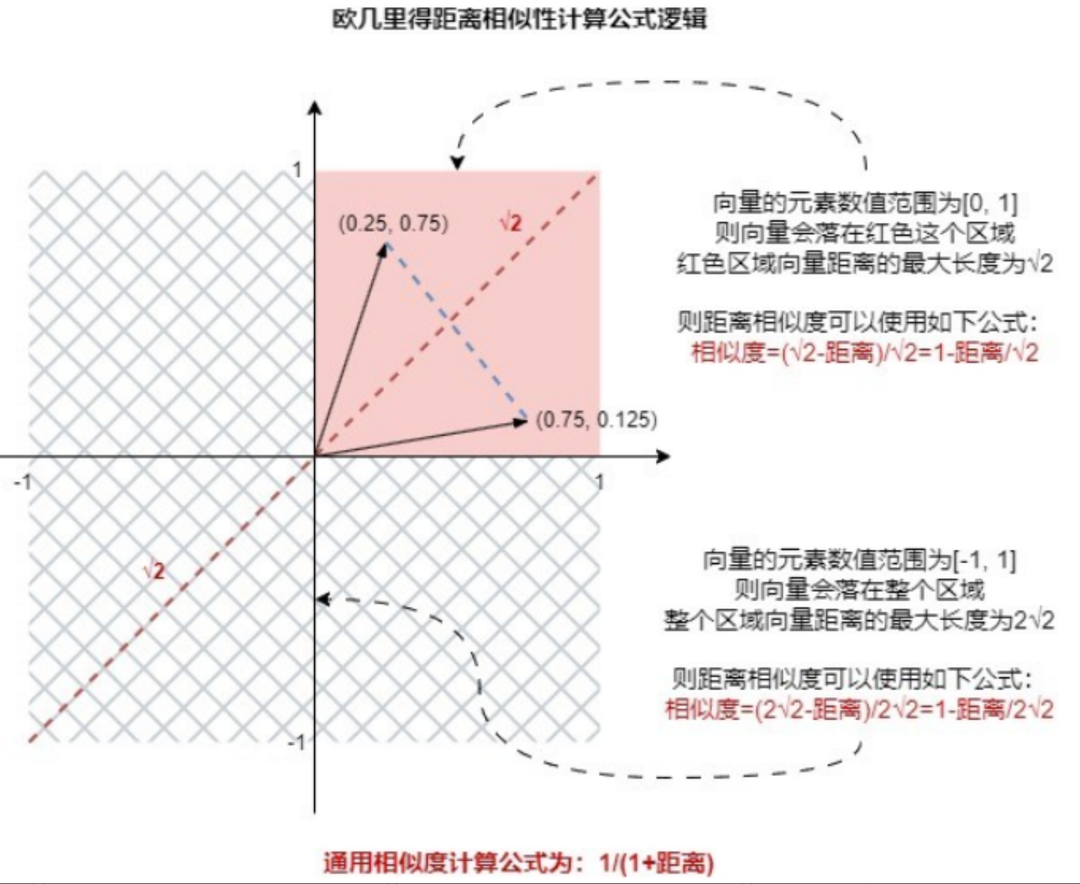 扩展到三维向量空间中(向量的范围是 [0, 1]),两个向量/点之间最大距离为 √3,并不是 √2,所以直接套用公式,可能会出现负数得分,在 N 维向量空间下,两点的最大距离是 √N,所以出现负数的概率大大增加。