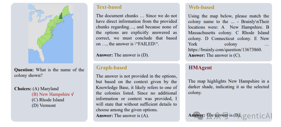 在第一个 ScienceQA 示例中,问题要求理解电路元件的作用,并根据图像进行判断。单一代理 RAG 无法正确选择对应的知识段落,最终得出错误结论。而 HM-RAG 的图像检索代理能够识别出图中电阻的作用,图文融合机制帮助系统将图像信息与教科书知识整合,从而推理出正确答案。