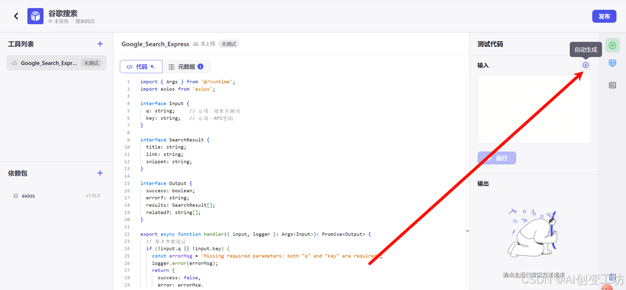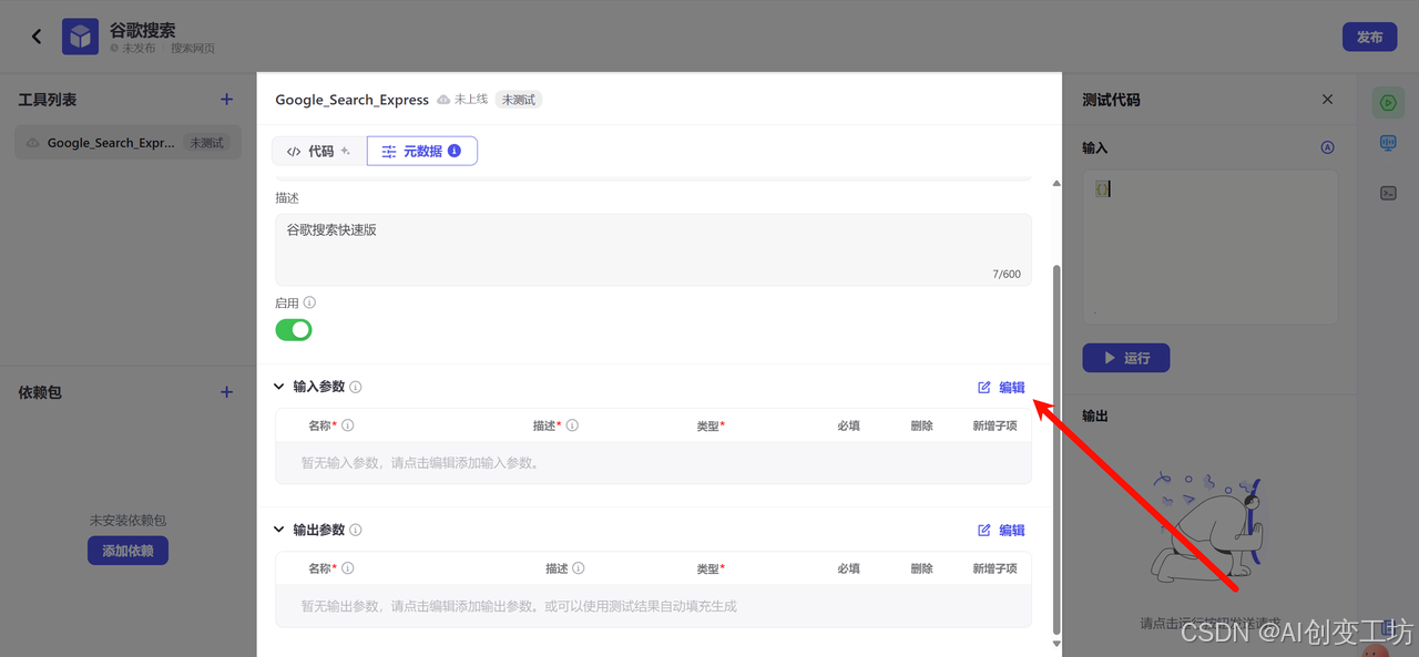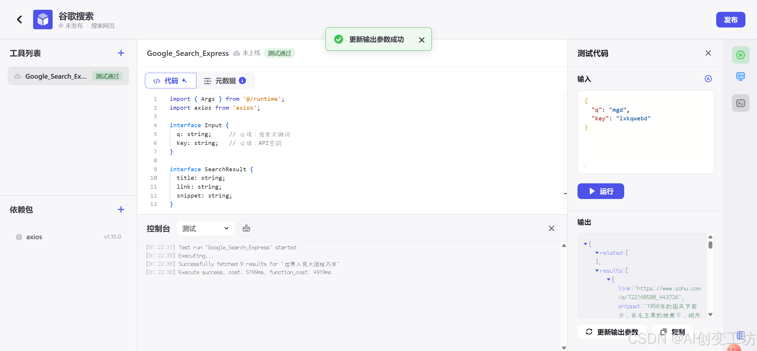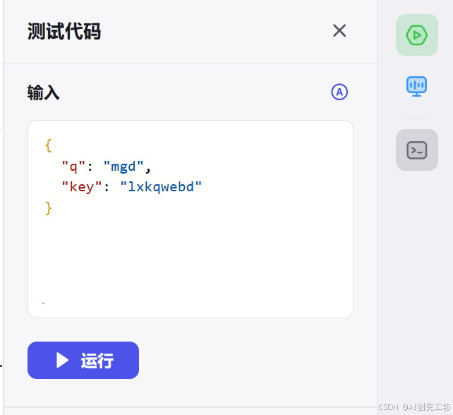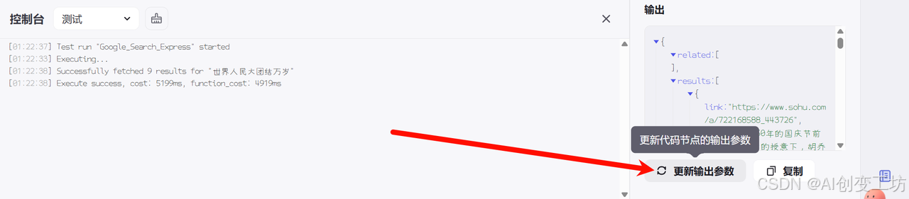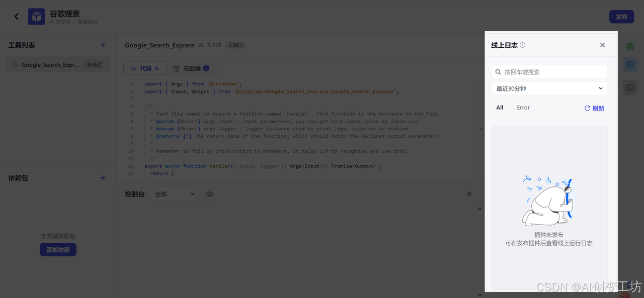 让我们先看测试代码,分别有输入、输出;一般我们做测试的时候只需要写输入就可以使用了,输出后面可以让Coze一键生成。而控制台是我们查看运行日志。