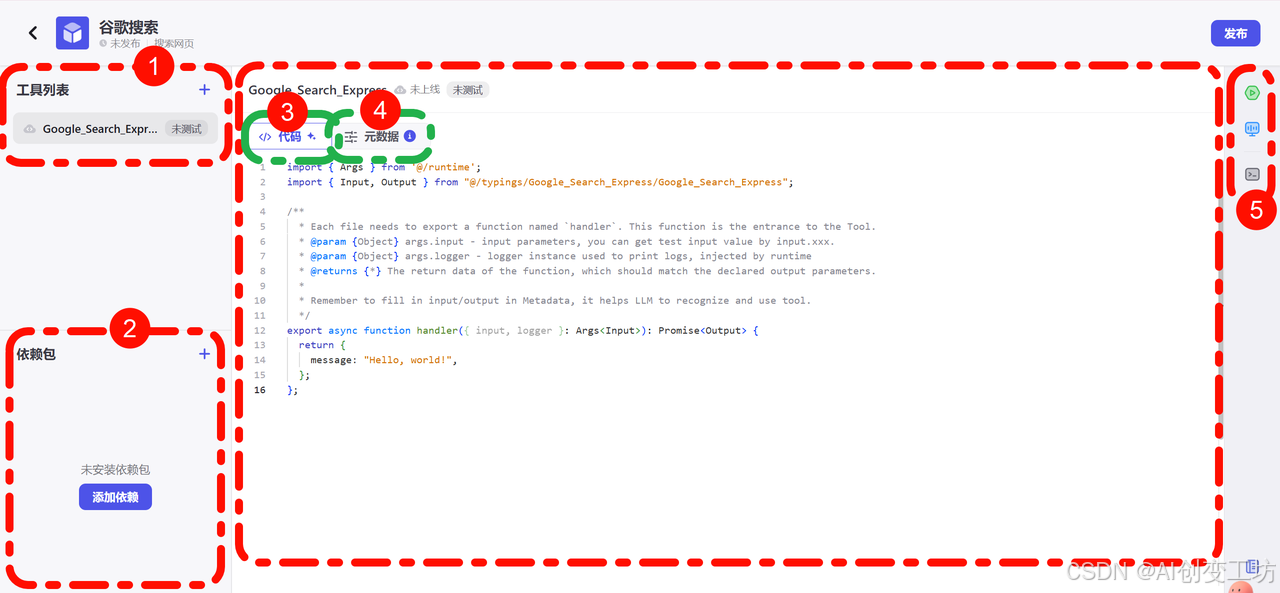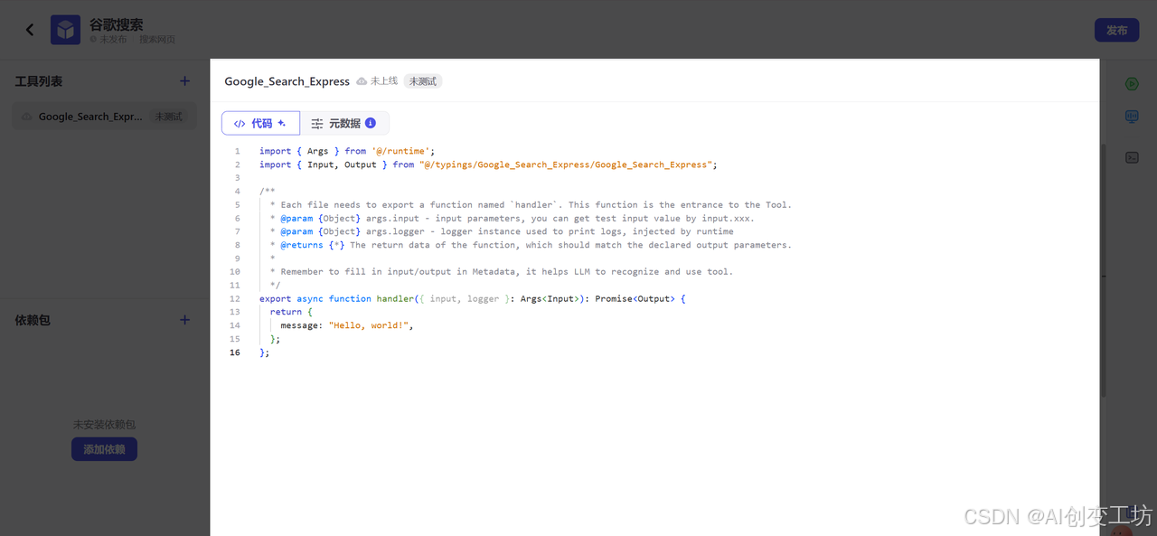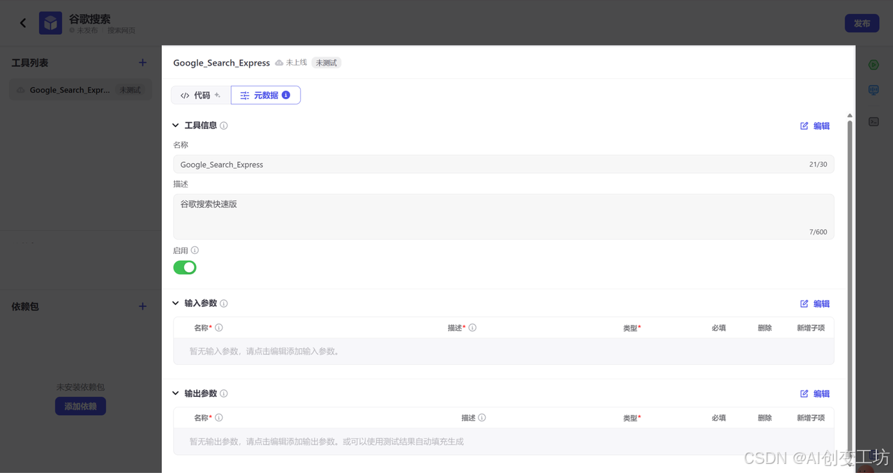 这里是工具列表,我们刚才新建了一个Google_Search_Express,所以不是空置,有同学要问了,这里对应商店的是哪里,让我们以飞书云文档为例