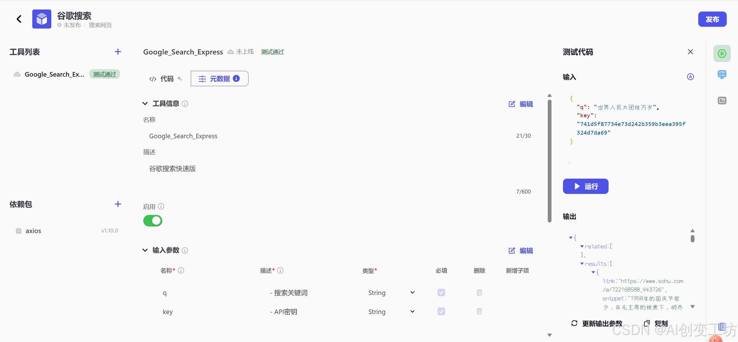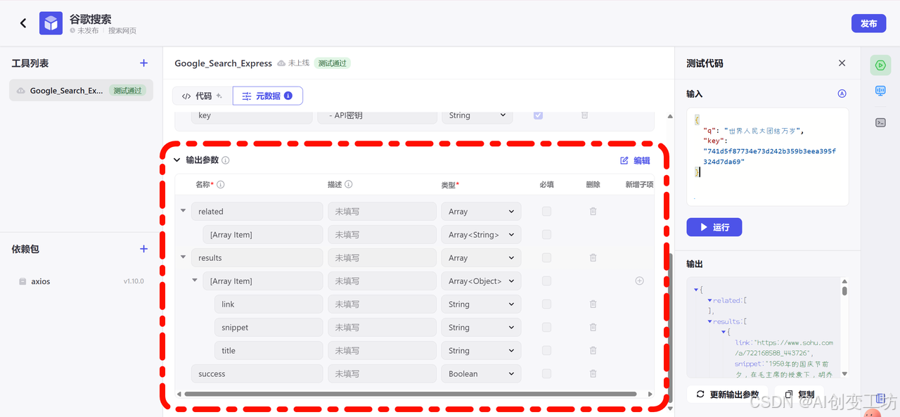 当前工具对应接口的输出参数信息。准确、清晰易理解的参数名称、描述等信息,可以让大语言模型更准确的使用工具。 |