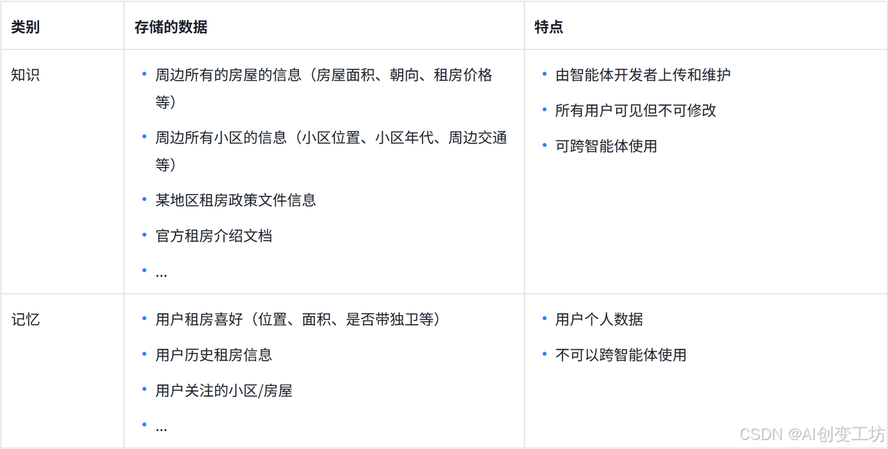 以一个租房平台的智能体为例,下表展示了哪些数据是需要通过知识功能来维护的,哪些数据是通过记忆功能来维护的。