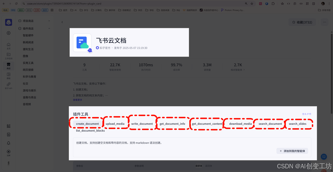 大家可以发现,插件是有好几个工具的,还记得前面说的“插件是一个工具集,一个插件内可以包含一个或多个工具(API)。”,我们刚才创建的插件是有一个工具(当然也可以有多个),而飞书云文档有多个。