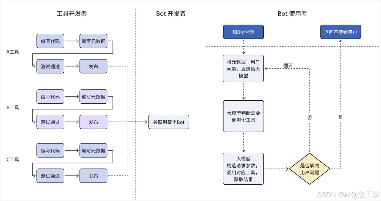 当用户在使用该工具的智能体时,模型会根据工具的元数据信息,从用户问答中解析、提取出对应的输入参数,并选择调用该工具,流程图如下所示。