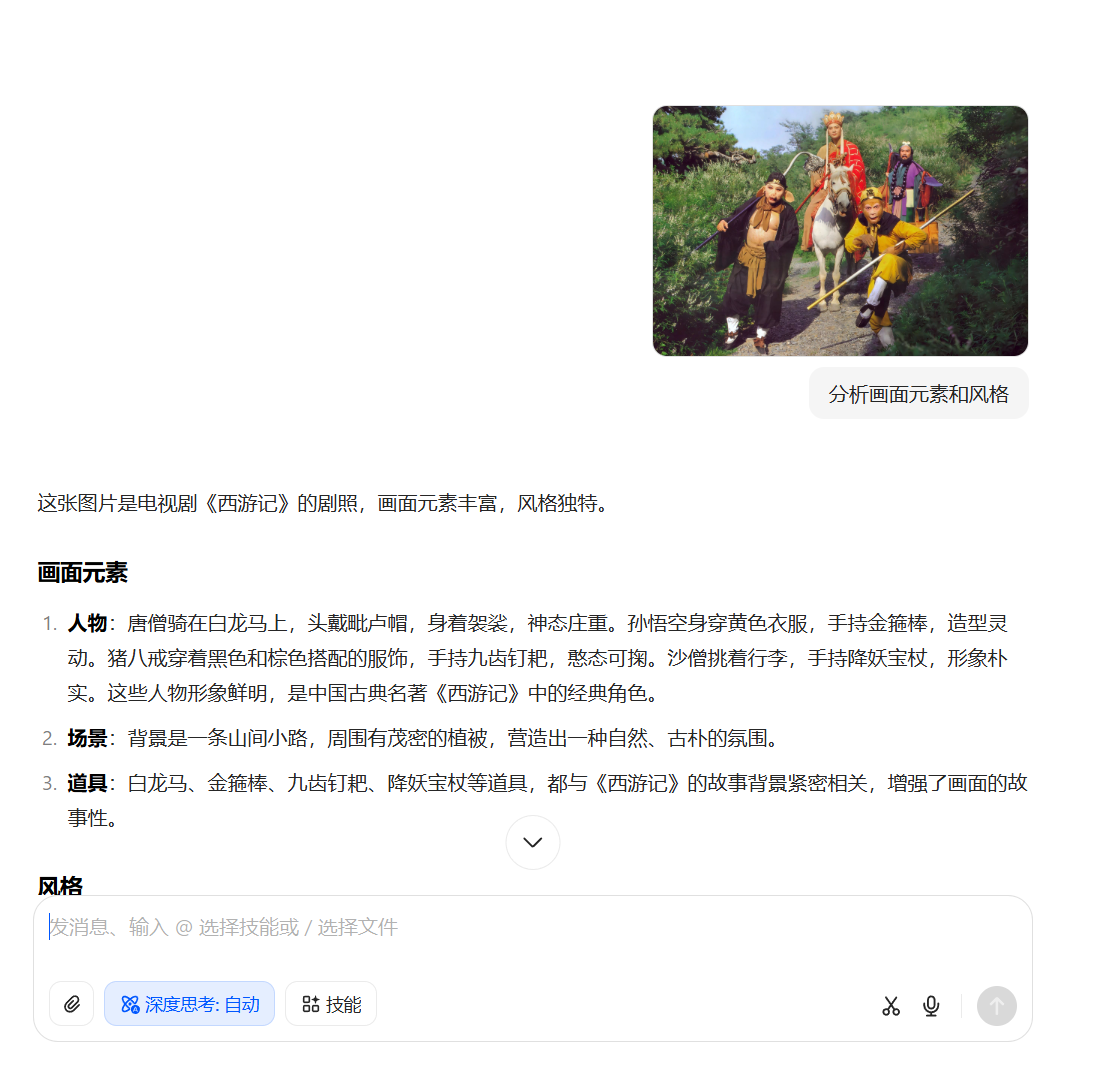 豆包的“图像理解”就特别适合做这件事:上传一张图,它能直接分析画面元素和风格,帮你还原出大致的提示语句。你拿这个提示词重新生成一张图,再进一步用来做视频、做剪辑、做包装,内容就自然成型了。
