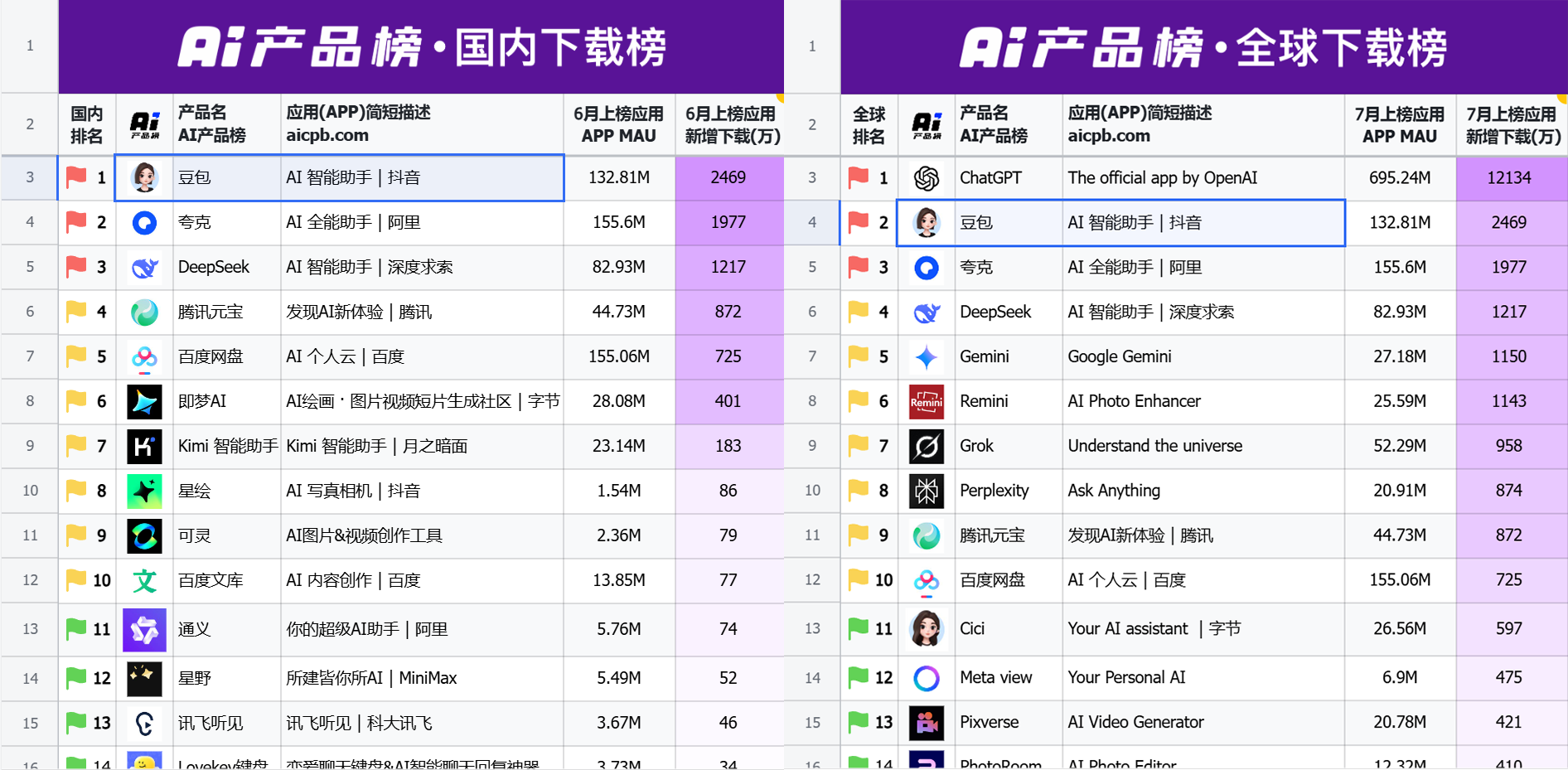 豆包6月的国内下载量,已经排到第一;7月的全球下载量,已经排到第二,甚至超过了DeepSeek。真的是默默爆发型的典范。