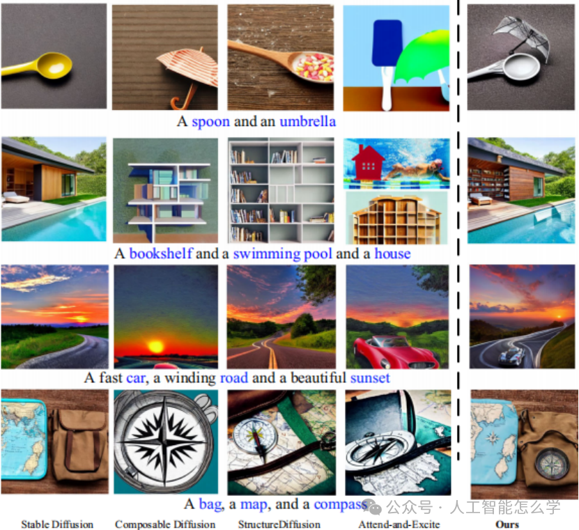 对MaskDiffusion与Stable Diffusion,Composable Diffusion,StructureDiffusion和Attend-and-Excite的视觉比较可以看出,从生成的图像来看,MaskDiffusion方法在所有五个模型中表现最佳。