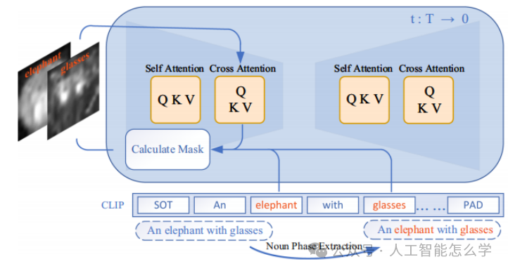 通过在文本提示嵌入和交叉注意力图上添加一个条件掩码,整体流程如图2所示。给定一个文本提示,一开始提取与视觉内容中存在对象对应的所有名词和形容词。在采样过程中,使用Stable Diffusion的预训练U-Net网络在每个时间步进行去噪,同时将掩码应用于交叉注意力块。具体来说,掩码M是通过一个算法计算交叉注意力图得到,重点关注选定标记,如对象名词及其相关属性。为了在推理过程中优化计算效率,仅计算与提取出的名词和形容词相关联的注意力掩码,而忽略其他文本标记。