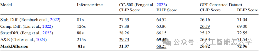 在这五种模型中,Attend-and-Excite表现出最慢的推理速度,这主要是由于单一采样时间步内的迭代优化所致。MaskDiffusion推理大约需要81秒,与原版Stable Diffusion相当,并且显著快于需要215秒的Attend-and-Excite。