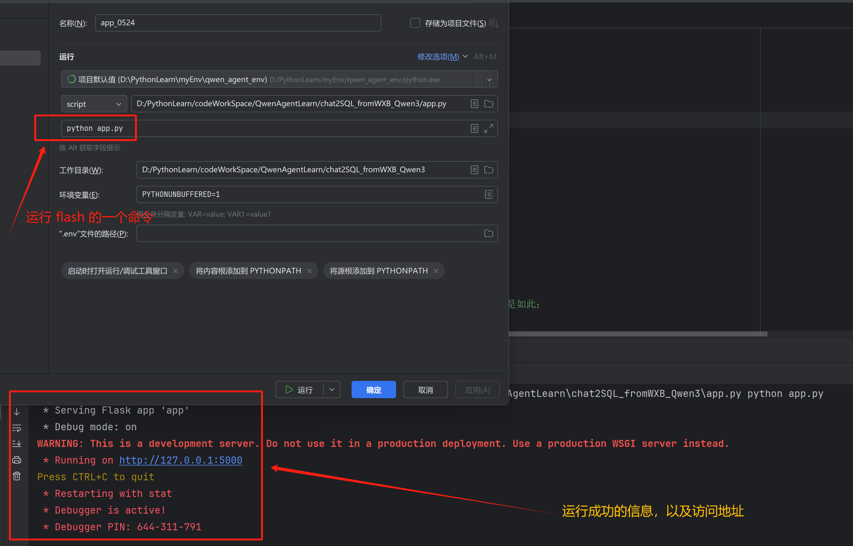 按之前的方式配置运行参数,运行新的 app.py,运行是成功的,说明生成的代码是可运行的。至此,主程序的工作机制优化完成。