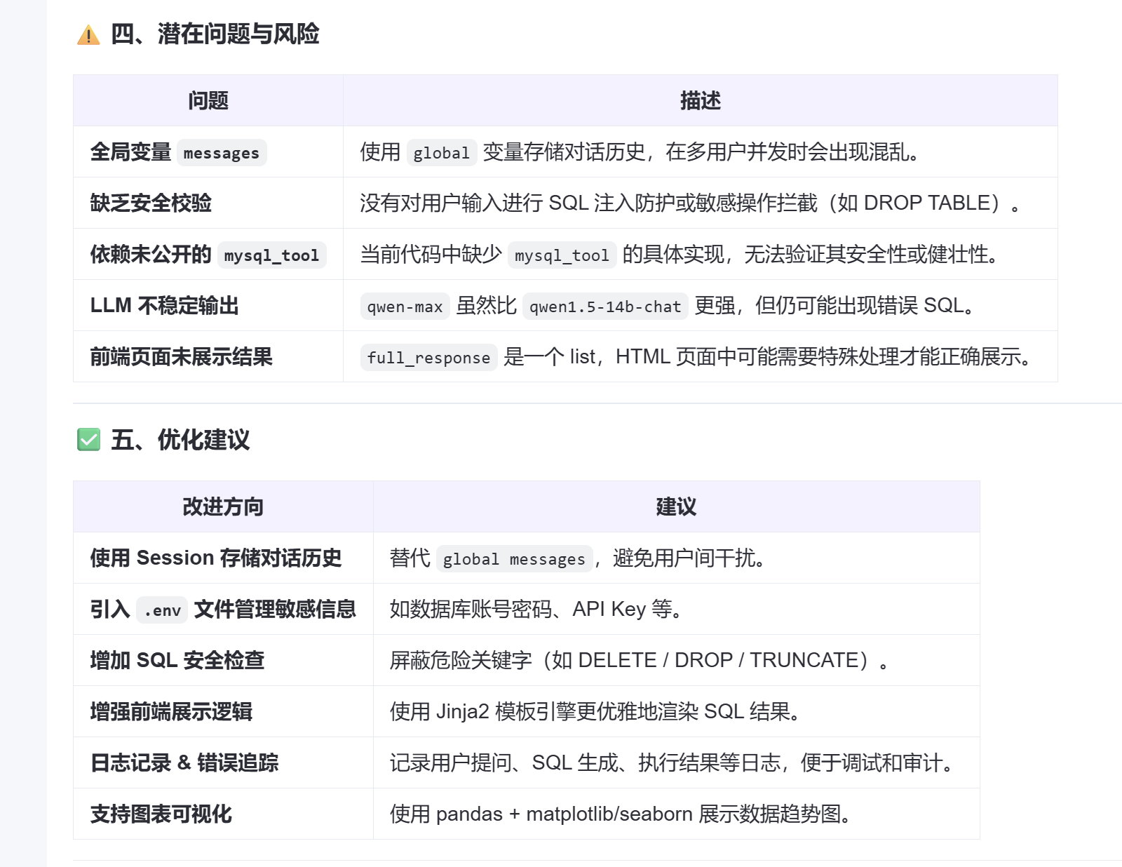 【优化描述】根据优化3,得到的代码,执行之后,生成的回复中是生成了 SQL的,只不过输出的是一长串分析,不是简单的结果。