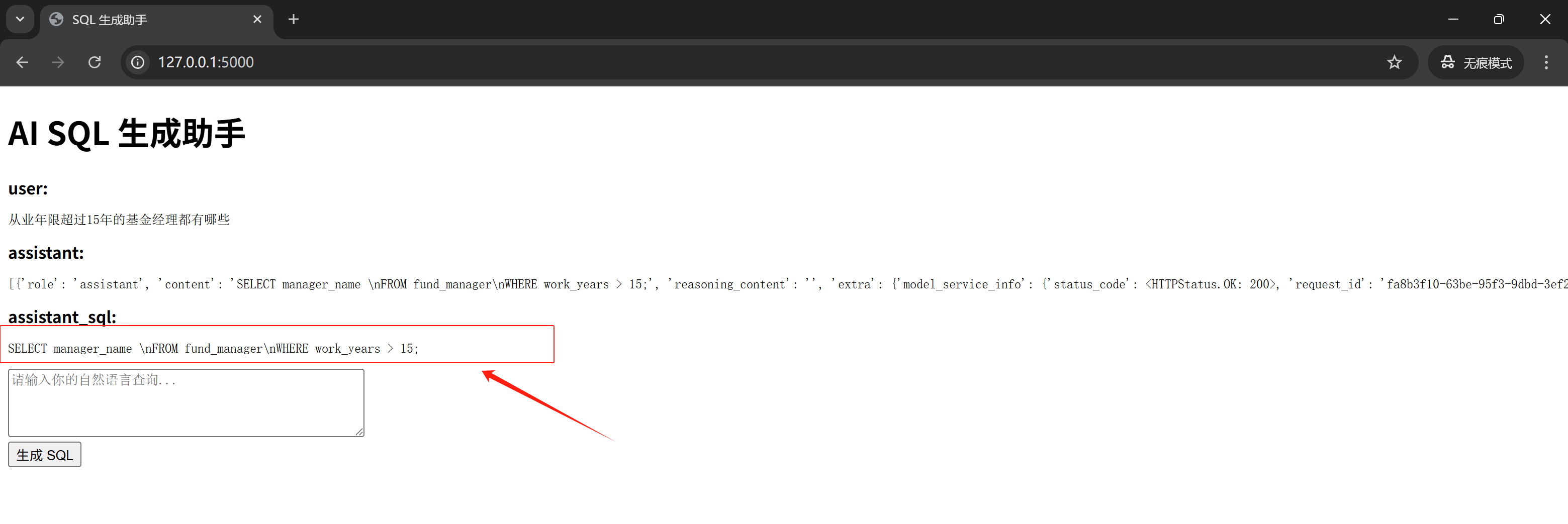 本文介绍了使用Python和开源框架Qwen-agent开发一个chat2SQL智能助手的项目。该项目旨在通过自然语言自动生成SQL查询,帮助用户筛选基金经理数据。文章详细描述了从Flask搭建Web服务、静态注入表结构到优化主程序工作机制的完整过程,重点解决了SQL生成与执行的核心问题。通过混合模式(AI生成SQL+代码执行)实现了稳定的SQL生成与查询功能,并展示了最终效果。