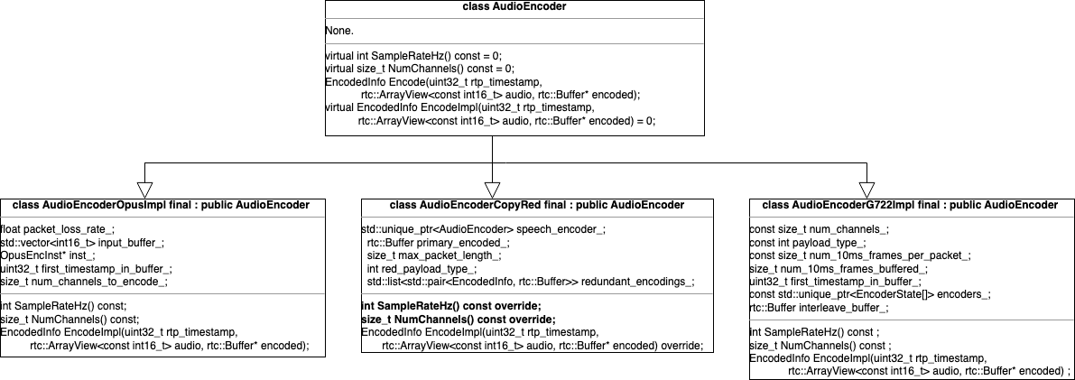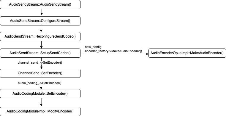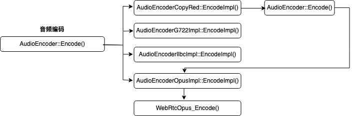 这些音频库在采集到音频后,都会调用AudioDeviceBuffer::DeliverRecordedData(),进入到编码、发送环节。函数第11行用到的audio_transport_cb_是在WebRtcVoiceEngine::Init()中完成注册的,真实调用的是AudioTransportImpl::RecordedDataIsAvailable(),该函数最终执行encoder_queue_.PostTask()。简言之,录制线程将录制的麦克风音频数据抛上来之后,送进编码线程,后者完成音频编码和网络发送的工作。